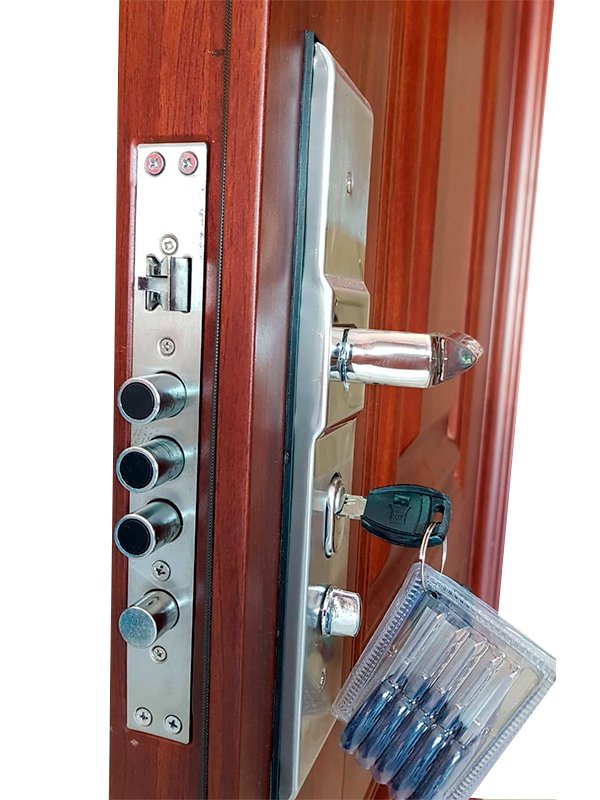 Puerta BLINDADA de Máxima Seguridad calidad de una hoja. Cerradura multianclaje de cierre manual con 10 pernos de acero. Bisagras ocultas antibarreta. Herrajes de Acero.
