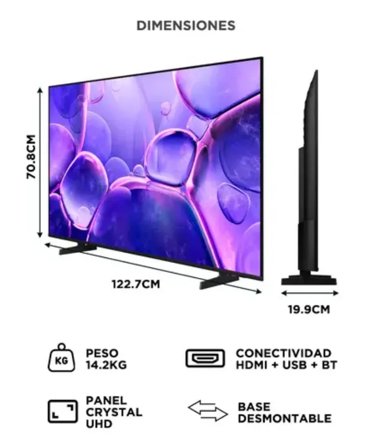Smart TV 55" Led HD .Conectividad: Wi Fi, BlueTooth, Ethernet, USB, HDMI . Apps Integradas: Youtube, Netflix, Disney+, Navegador Web